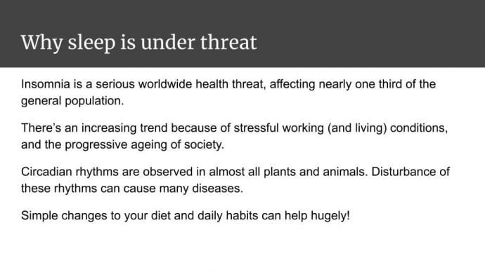 One of the most important factors for sleep is light. We all know that during the day, when you’re awake, it’s light and during the night, when you’re sleeping, it’s dark. It seems incredibly simple, but this is nature’s way of telling your body the time. Essentially, if you’re spending too little time outside in the daylight, or too much time in bright light at night, your body doesn’t know whether it should be awake or asleep! This is called the circadian rhythm – a natural, internal process that regulates your sleep-wake cycle.