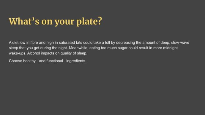 A healthy diet also contributes to a good night’s sleep. If you eat food that’s lower in fibre but high in fat, you’re less likely to have deep sleep. Similarly, whilst alcohol makes it easier to fall asleep, you’ll have difficulty staying asleep. These sorts of foods and drinks keep your body busy – meaning your sleep is more likely to be disturbed.