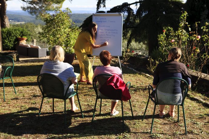 Well, they are very outdoorsy! All the villas we use have absolutely spectacular outdoor terraces – in Tuscany overlooking vineyards and hilltop towns, in Amalfi gazing across the sea towards Capri – so that’s where I set up the class room, al fresco. We usually do a couple of hours in the morning, then a couple more in the afternoon, but as much as possible – and this depends, of course, on the level of the guests – I encourage people to speak Italian. So at lunch, on daytrips to Capri, when we’re out for dinner in Positano, guests to do all the ordering, ask for directions and so on.